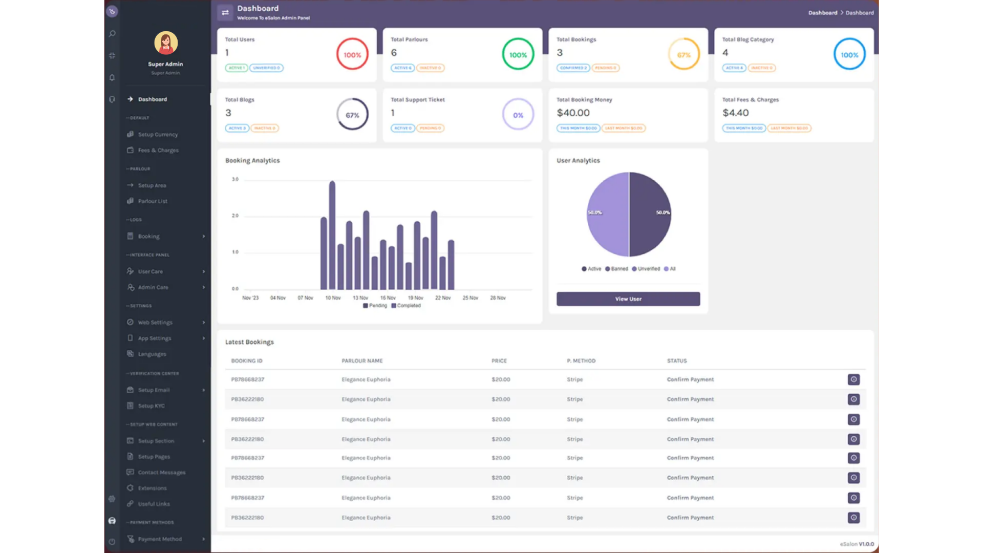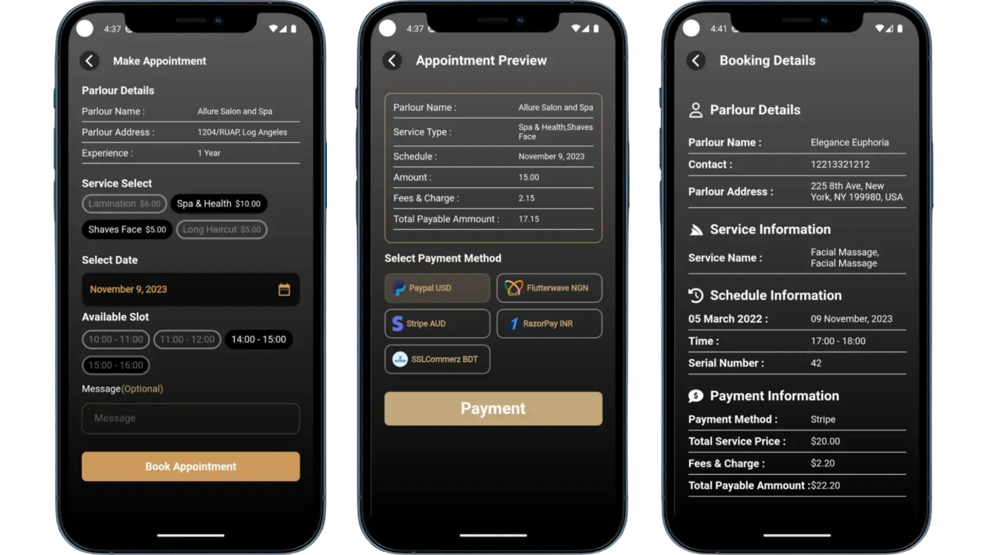 - Manage salon details, such as salon details, images, slots, awards, holidays, etc.