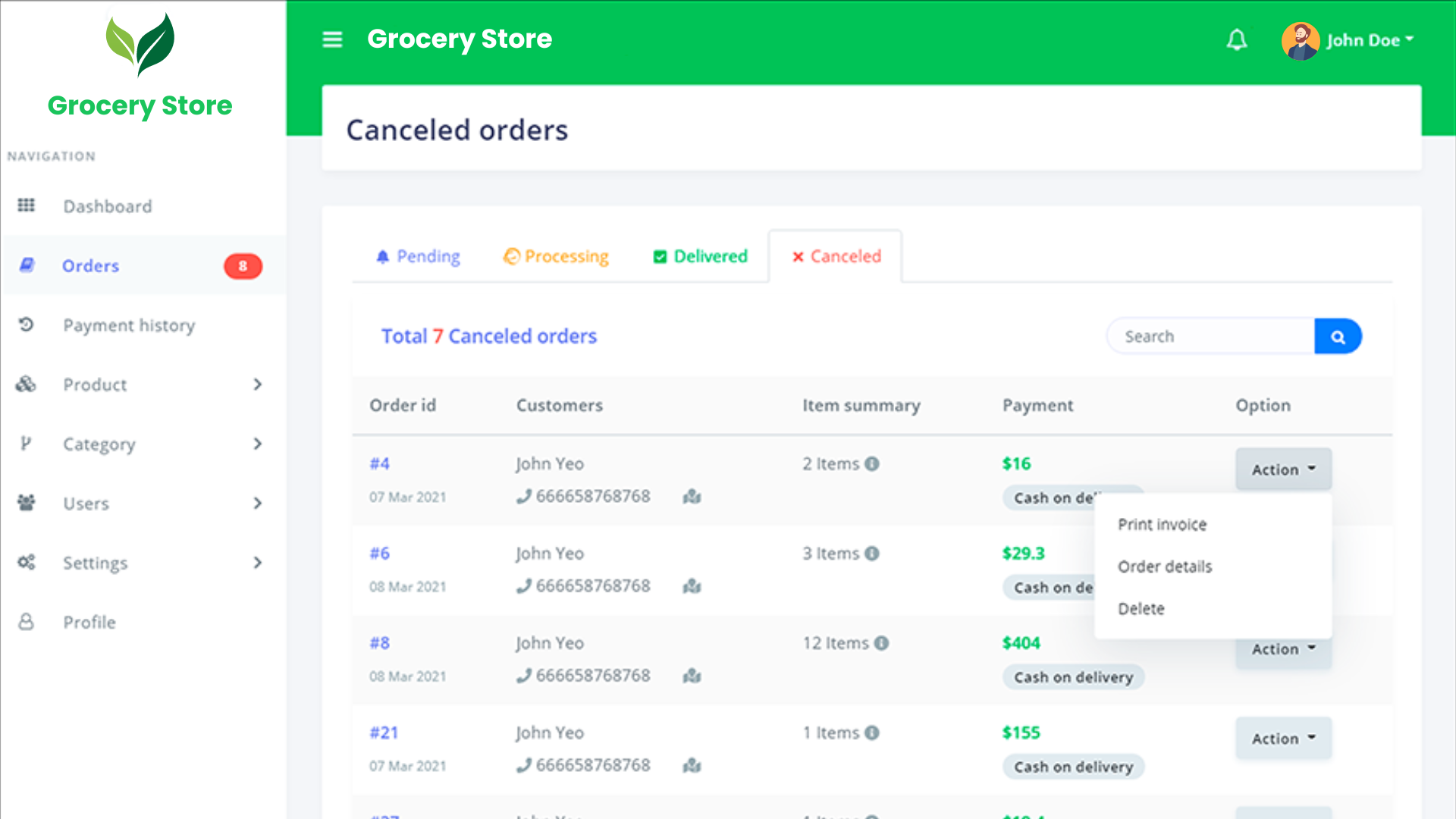 - Managing Orders: The admin can confirm a pending order and can assign a delivery boy to it. Admin can also see the order details as well as can print an invoice of it. As an Admin he/she can cancel the order as well.
