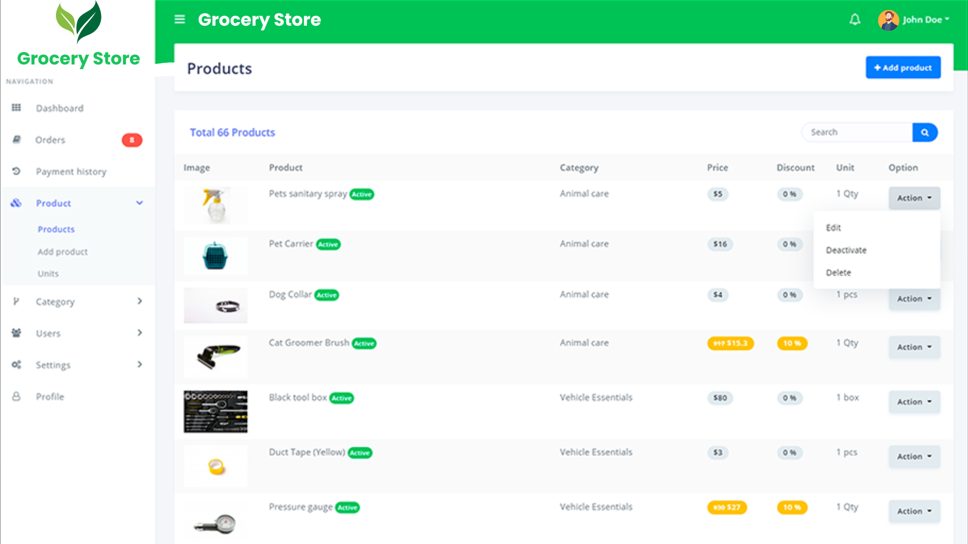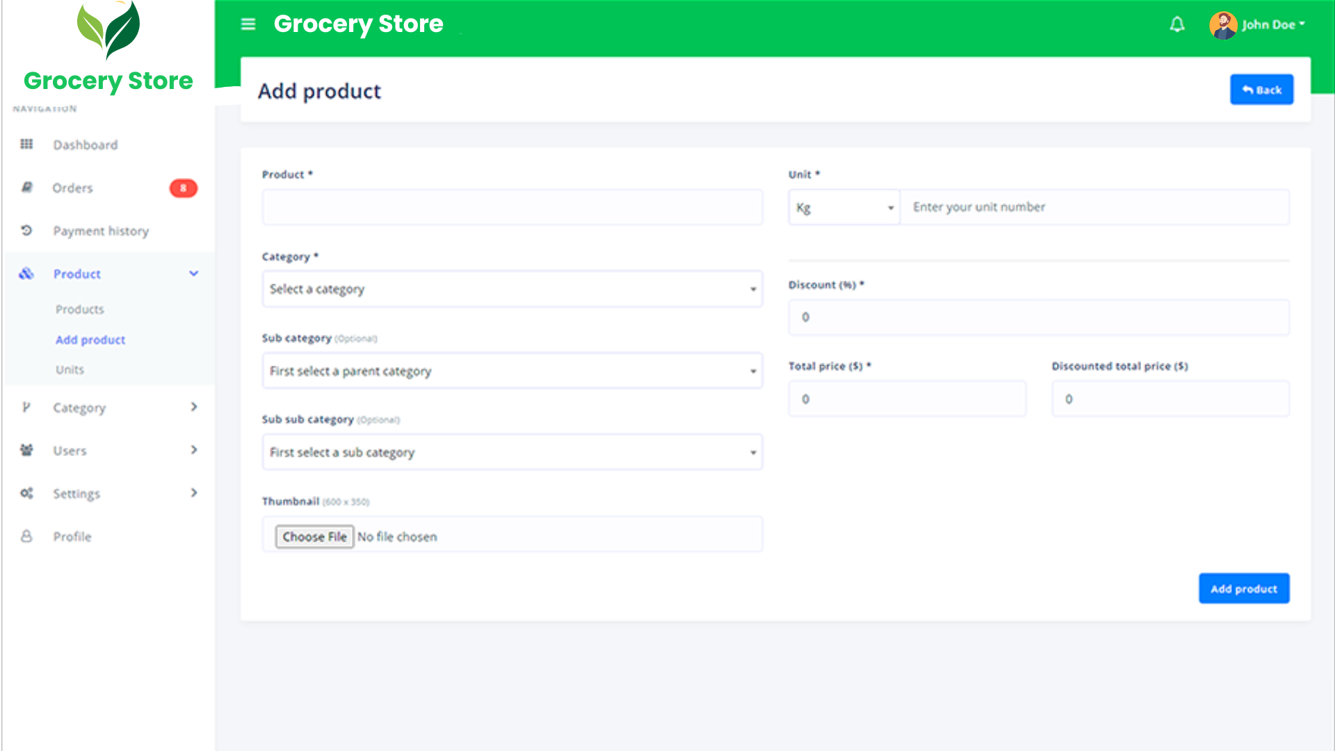 - Now, your system is ready to create products. Click the “Add product” sub-menu from the left navigation bar. You will see a form for adding a new product. Enter the required data and submit the form.