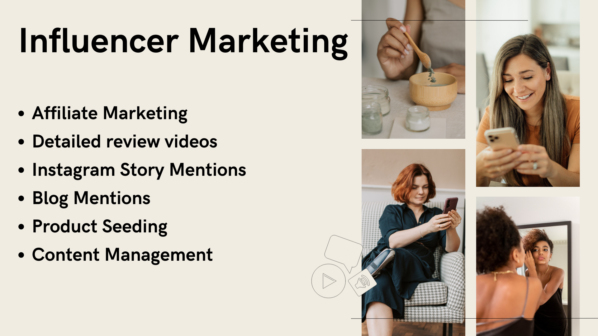 Influencer marketing services involve partnering with social media influencers to promote your brand. This can include creating custom content, organizing giveaways, arranging brand mentions, and setting up affiliate programs. These strategies help reach a wider audience, build trust, and drive sales through authentic endorsements.